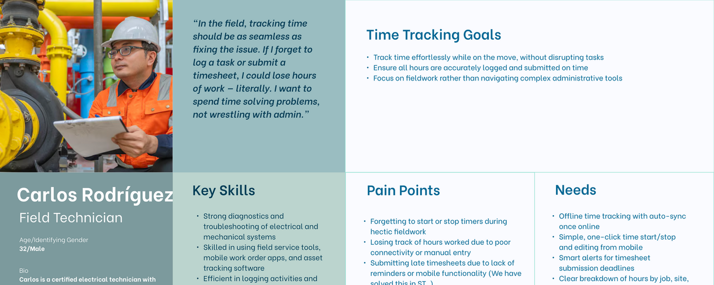 We didn't just sit in the office. We spent 3 weeks with field engineers, team leads and managers to understand the friction points in the current time tracking process and tools.